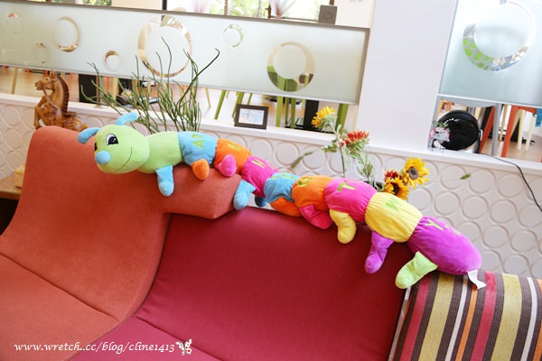 沙發上有彩色毛毛蟲.大青蛙,還有一隻懶骨頭狗狗,小朋友看了都想撲上去~